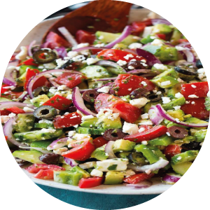 - In the large bowl, combine the salad, onion, olives, capcicums, tomatoes, cucumber andcheese.